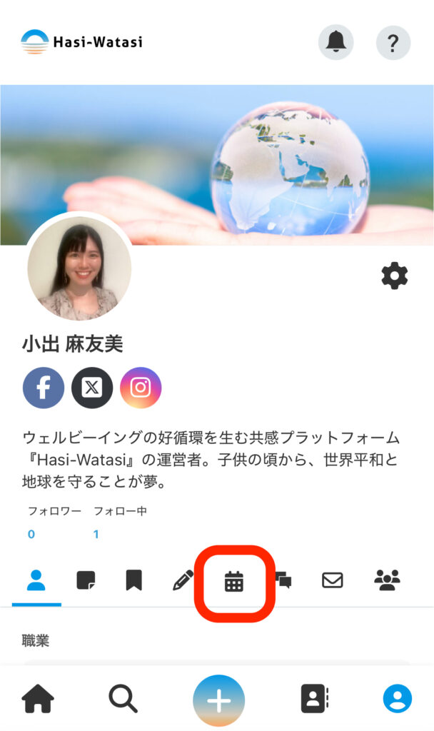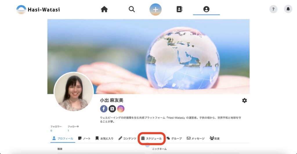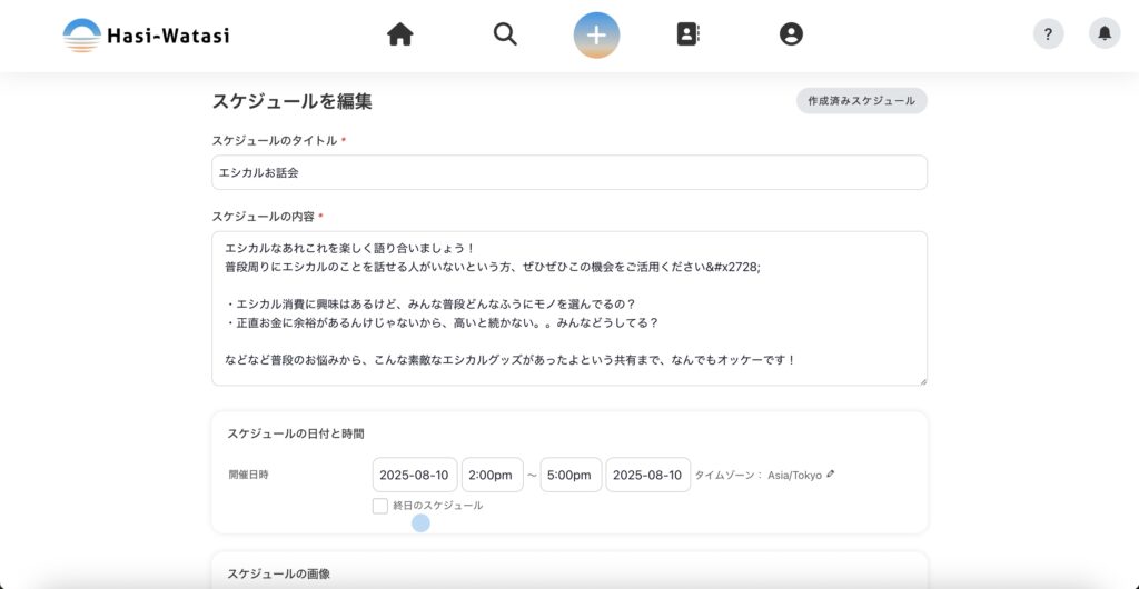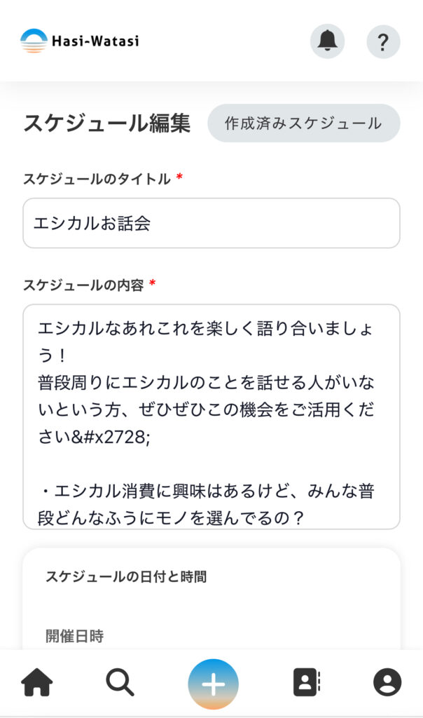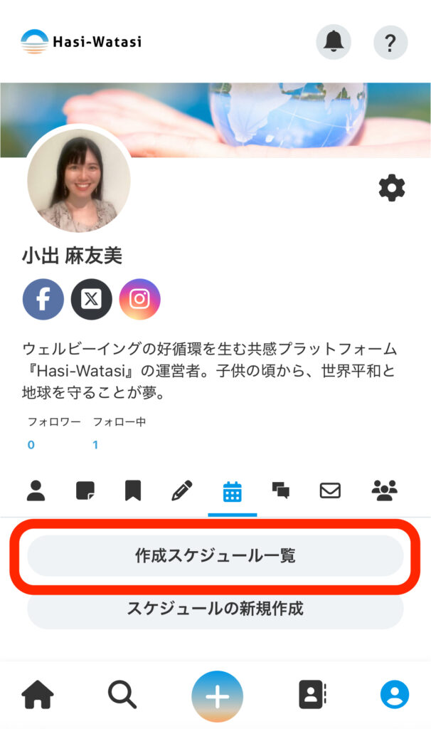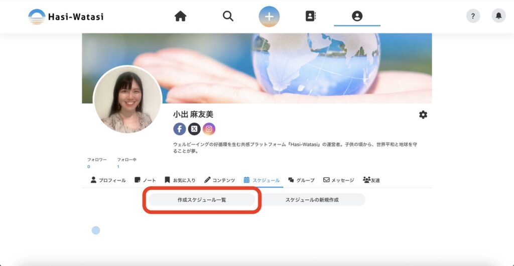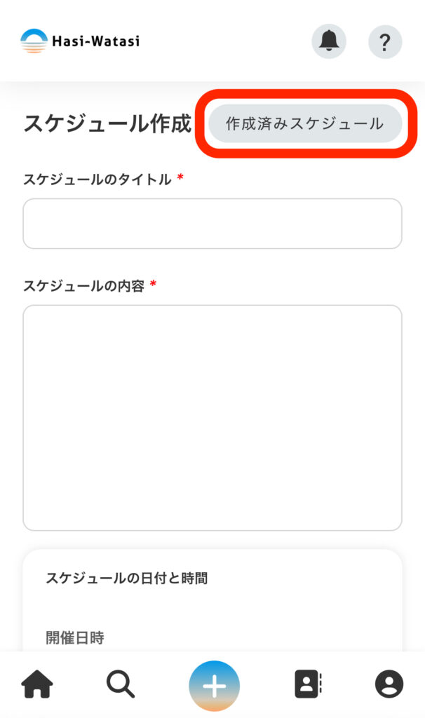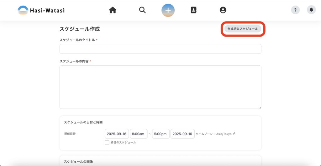「+」ボタンにカーソルを合わせ(スマホの場合は押し)、「スケジュール作成」を押し、「作成済みスケジュール」ボタンを押します。
