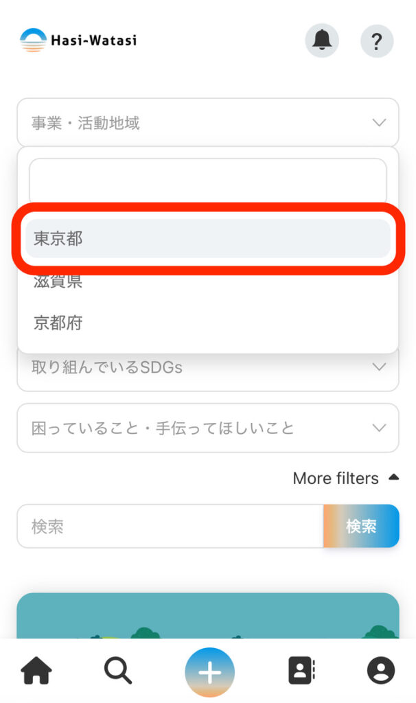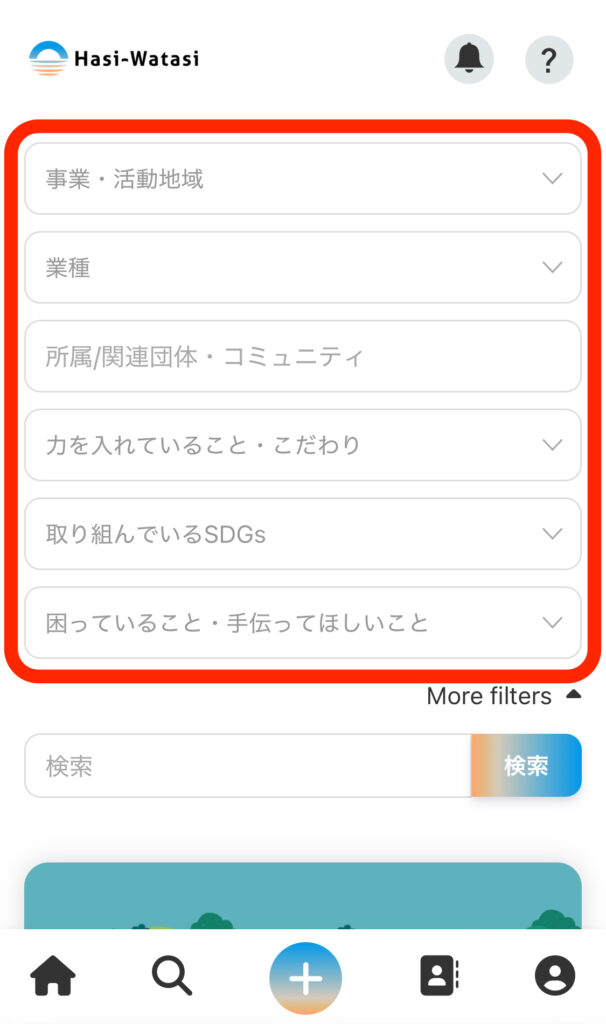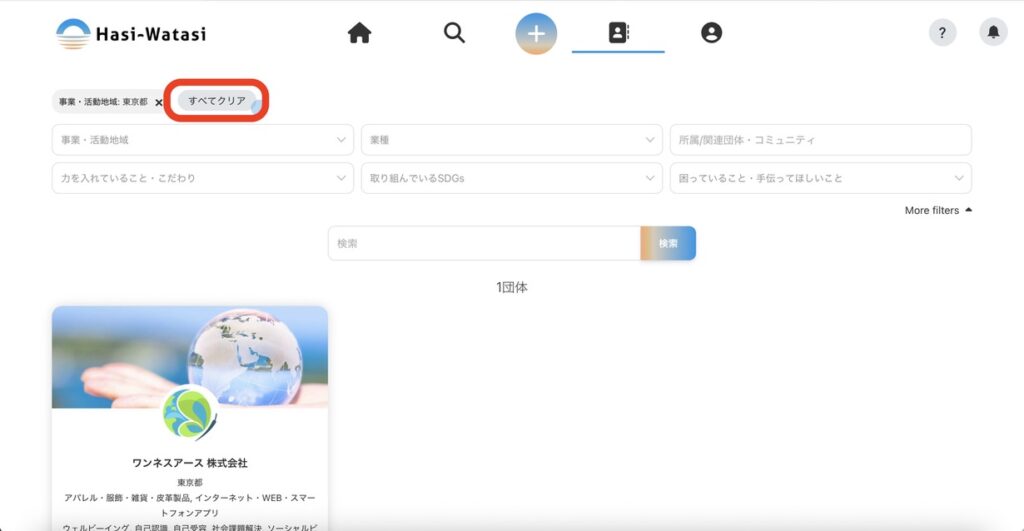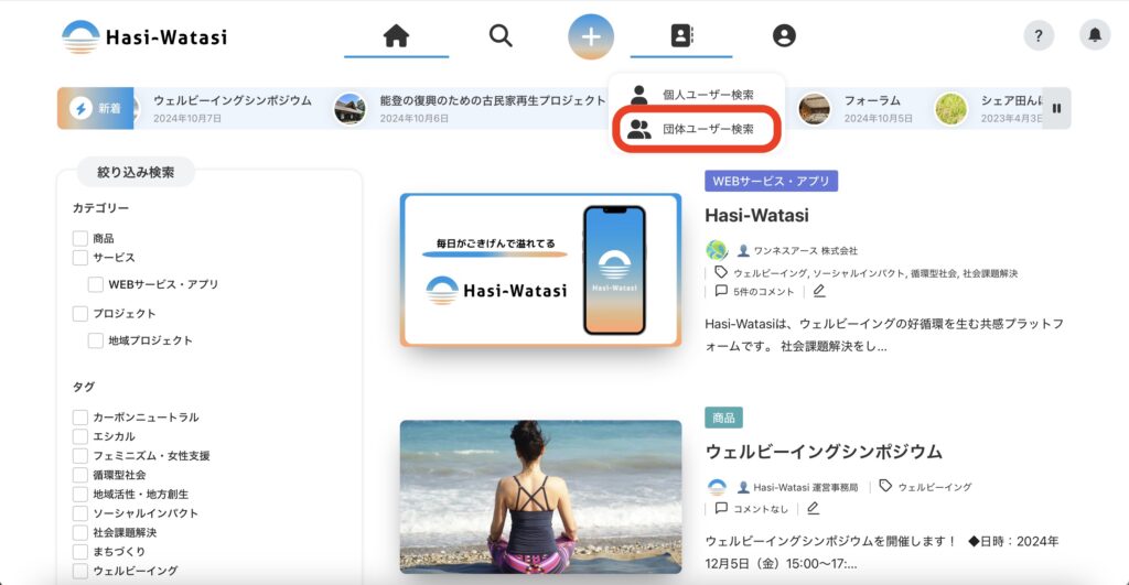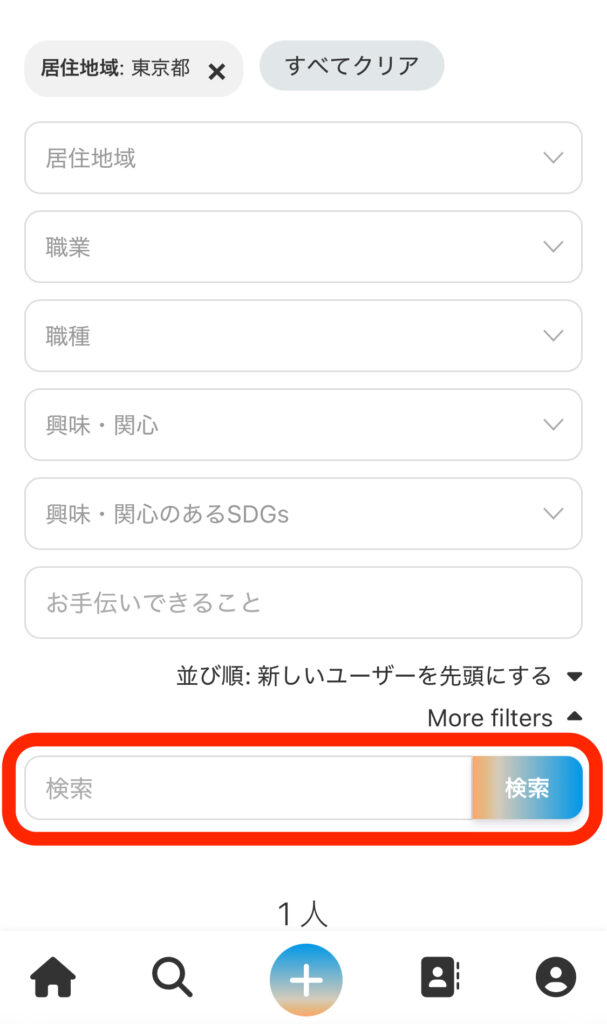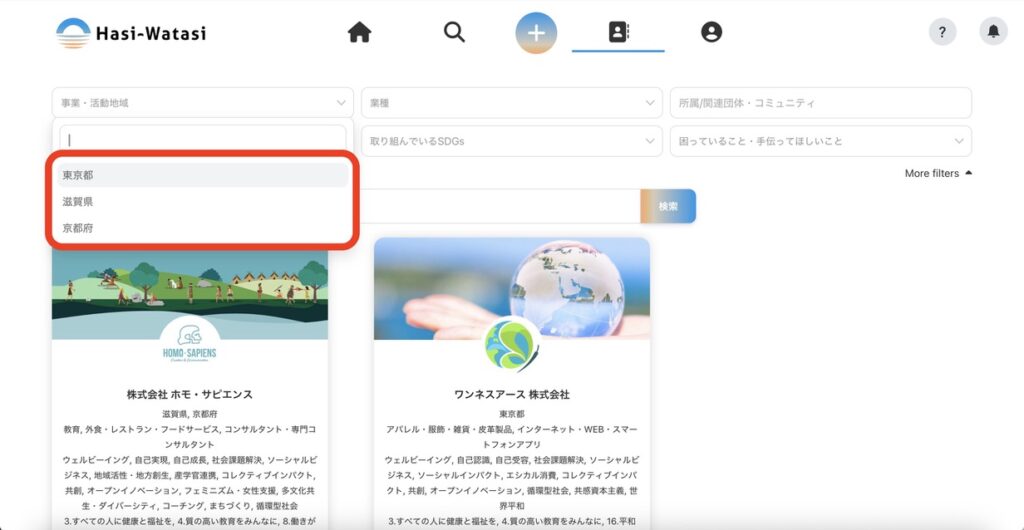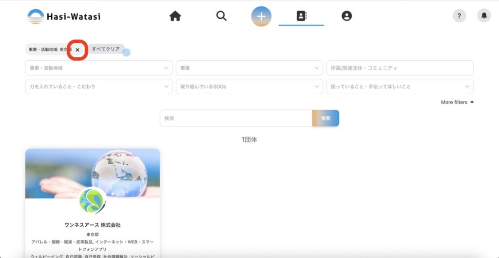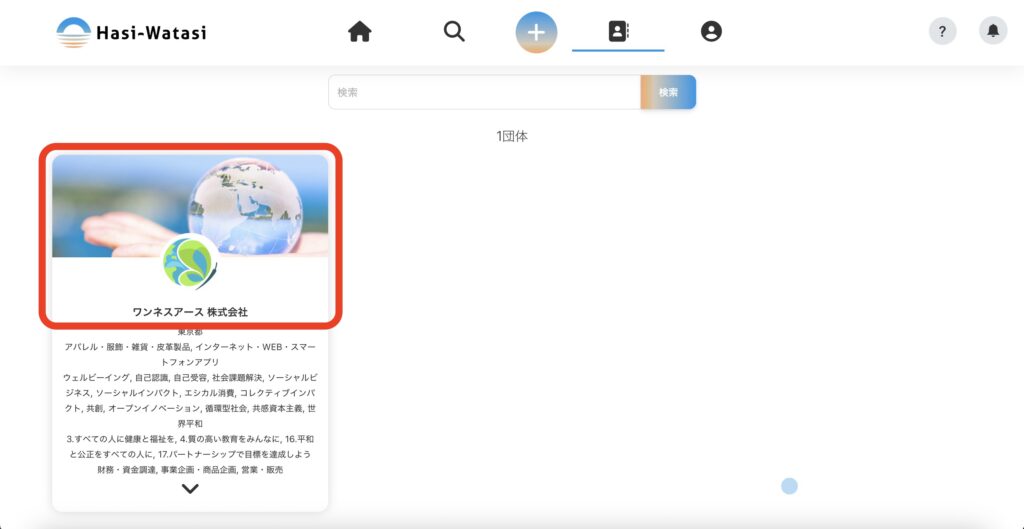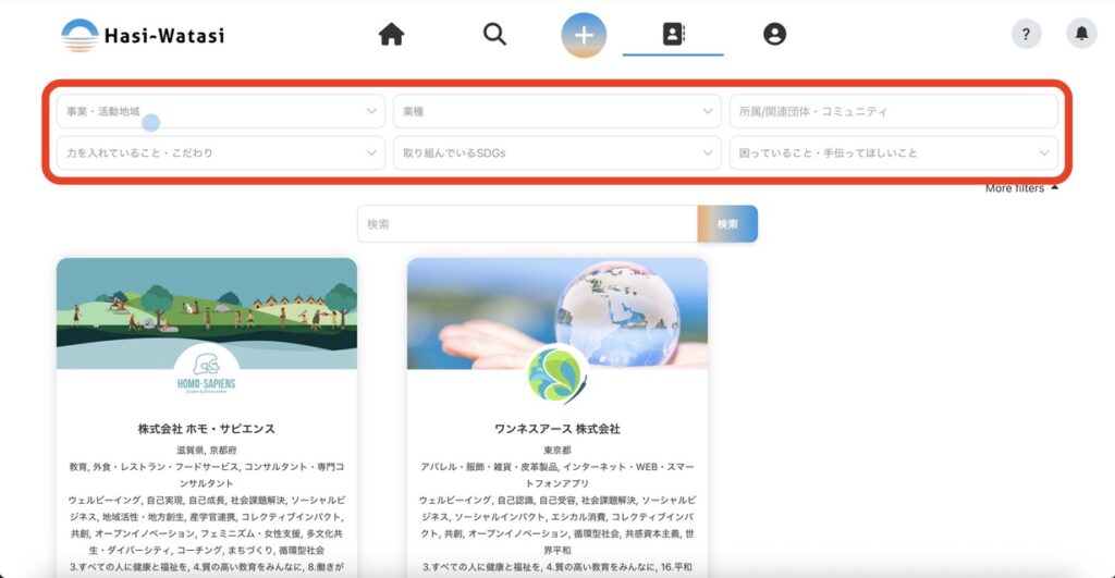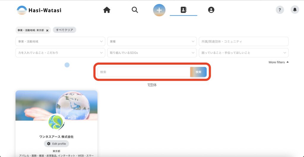 団体のユーザーも検索することができます。プロフィールに書かれた内容をもとにフィルターをかけたり、キーワードで検索ができます。自分と似たような価値観の団体を探したり、一緒に活動したい団体を探すことができます。