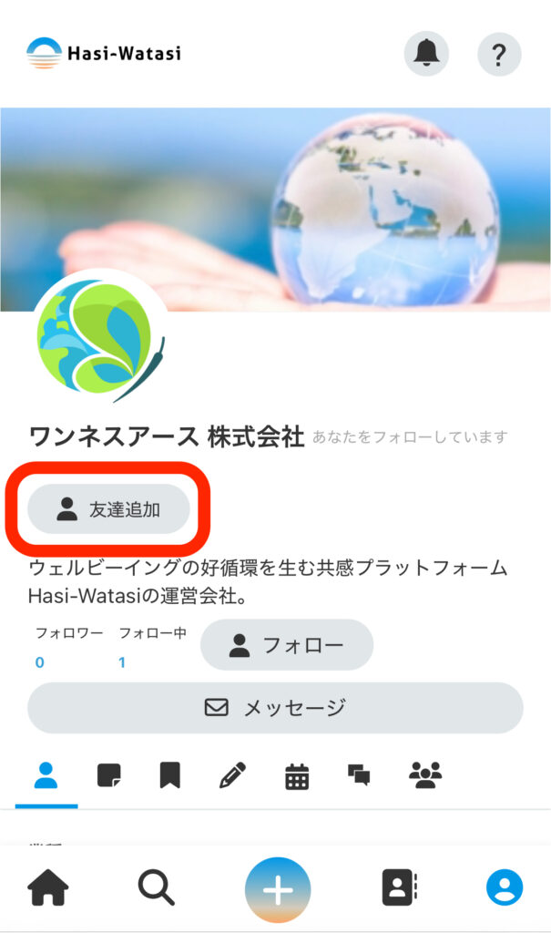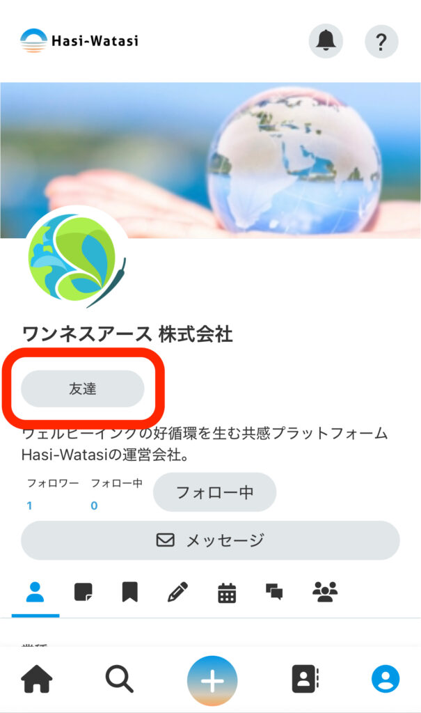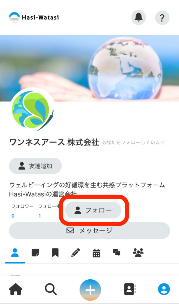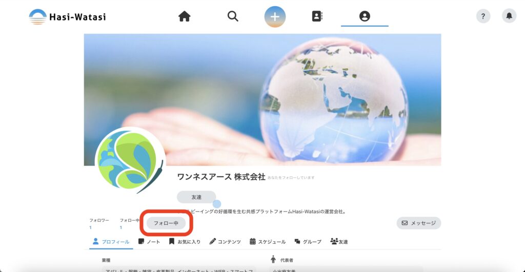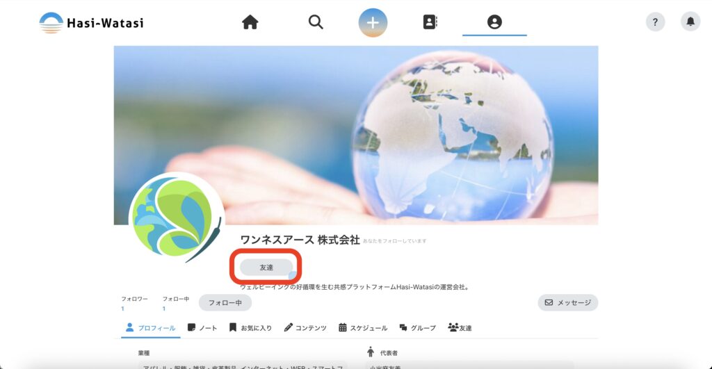 ⑥気になった団体ユーザーは、「友達追加」ボタンを押して友達申請を送るか、「フォロー」ボタンを押してフォローすることができます。