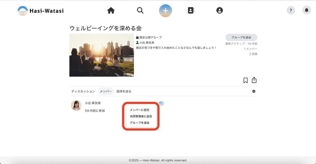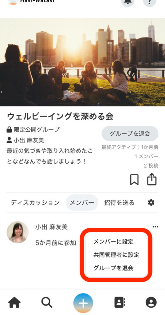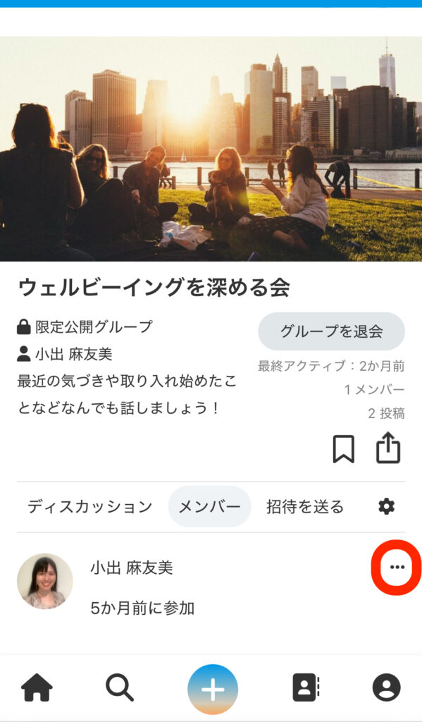 ⑦ユーザーの右上にある「・・・」マークを押します。権限の変更をしたり、グループを退会させることができます。