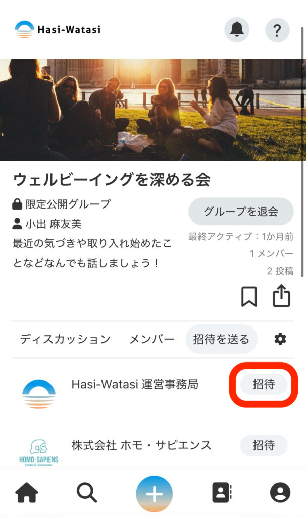 ③ユーザーを招待したいグループを検索し、該当のグループを見つけたら画像またはタイトルを押します。