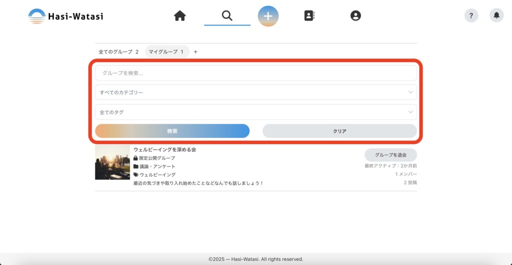 「虫眼鏡」アイコンにカーソルを合わせ(スマホの場合は押し)、「グループ検索」を押し、「マイグループ」タブを押します。キーワード、カテゴリー、タグで検索し、該当のグループの画像またはタイトルを押します。