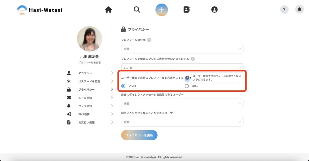⑥ユーザー一覧ページで自分のプロフィールが出てこないようにするかを選択します。「はい」を選択すると、ユーザー一覧に表示されなくなります。