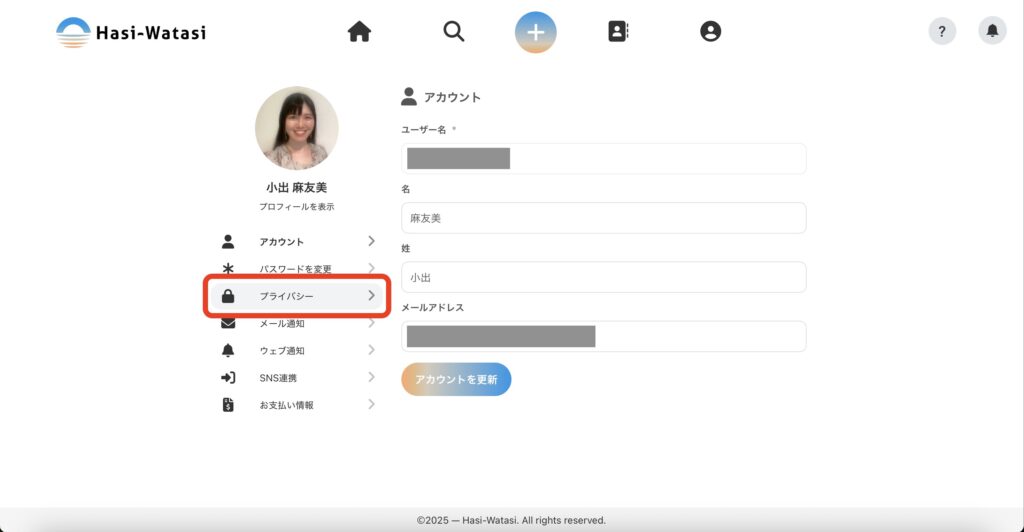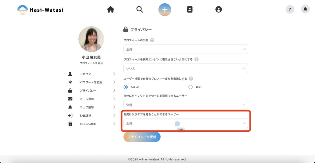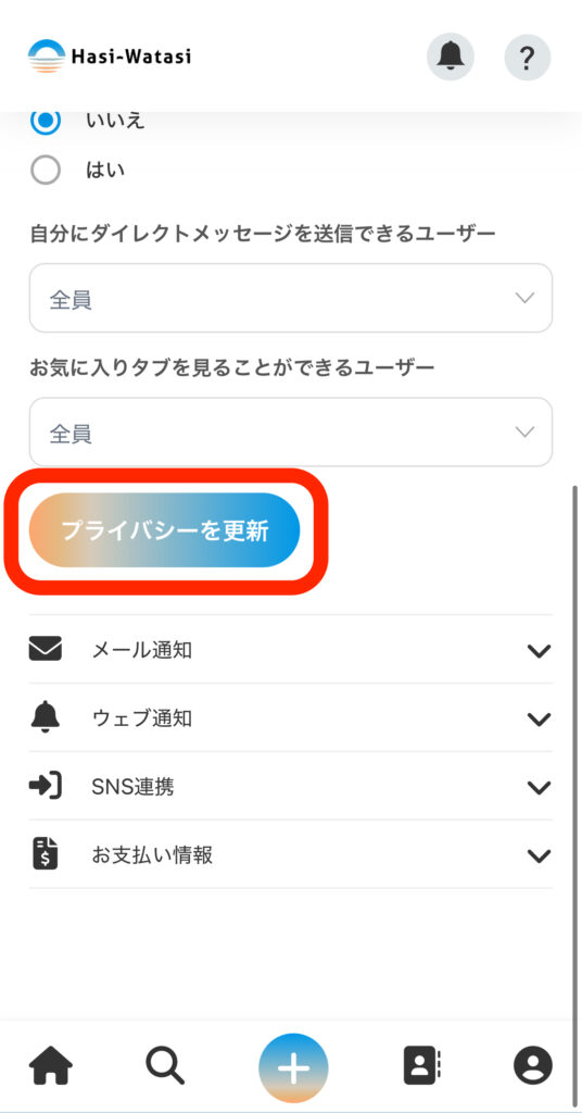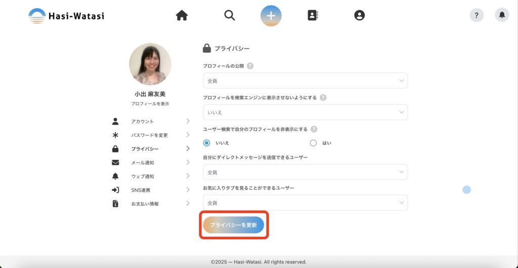 ⑧設定の変更ができたら、「プライバシーを更新」ボタンを押します。ボタンを押さないと変更が保存されませんので、ご注意ください。