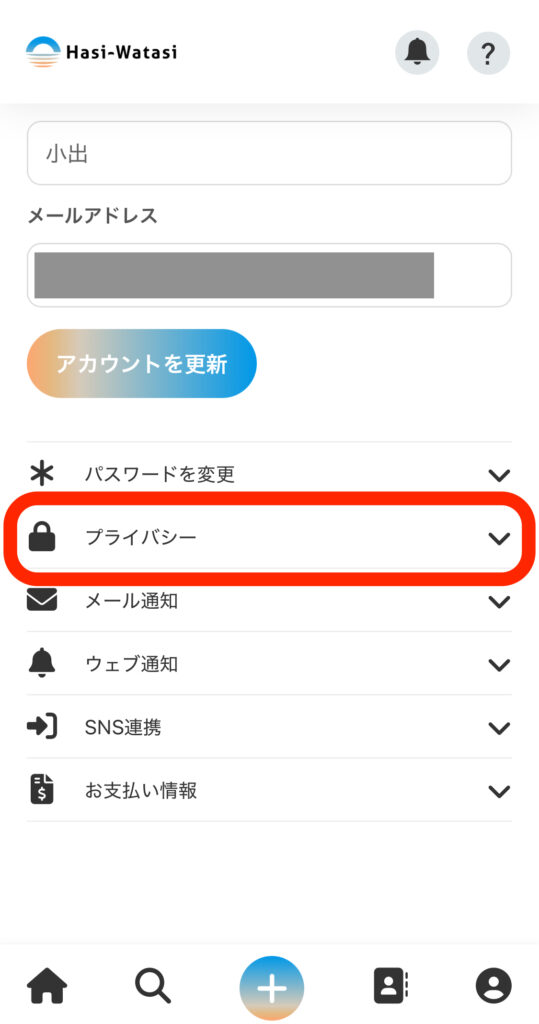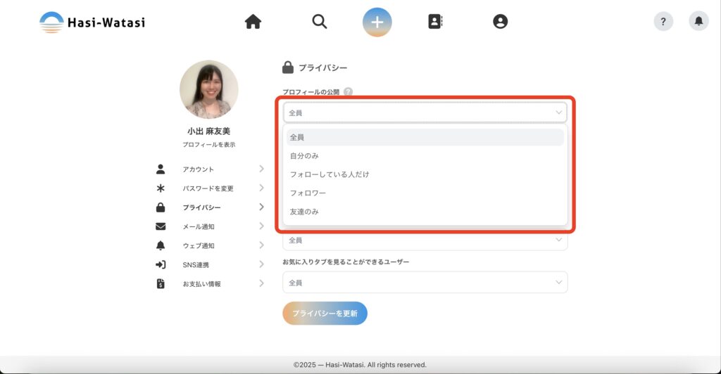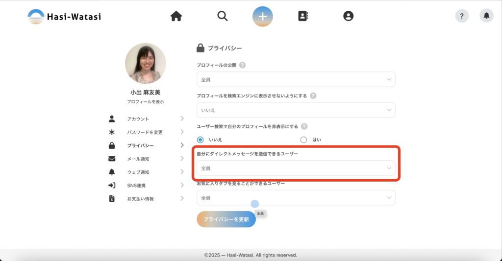 プロフィールの公開/非公開や、自分にダイレクトメッセージを送れる人を設定することができます。