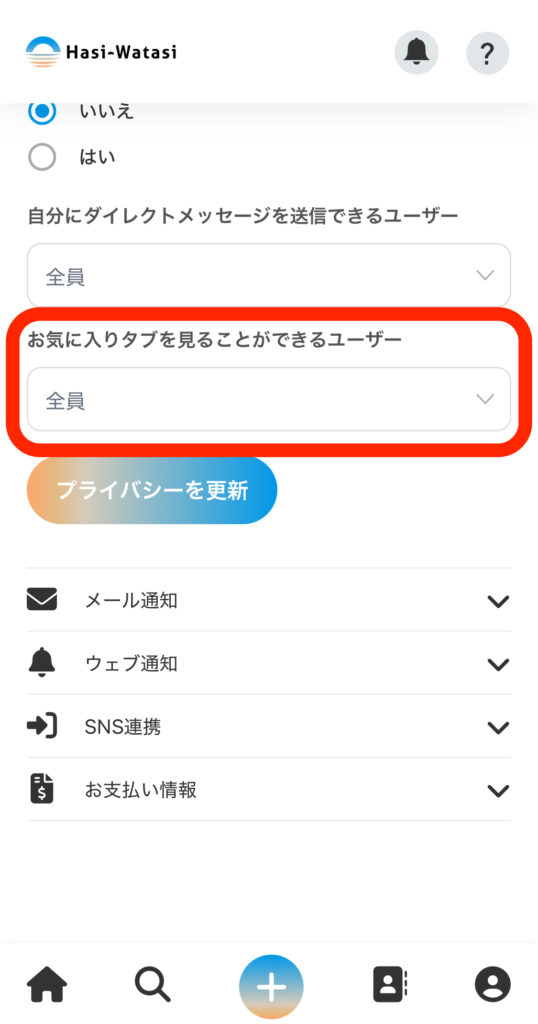 ⑧自分がお気に入りに保存したものを見ることができるユーザーを選択します。