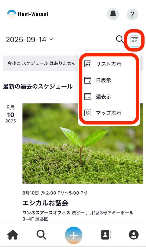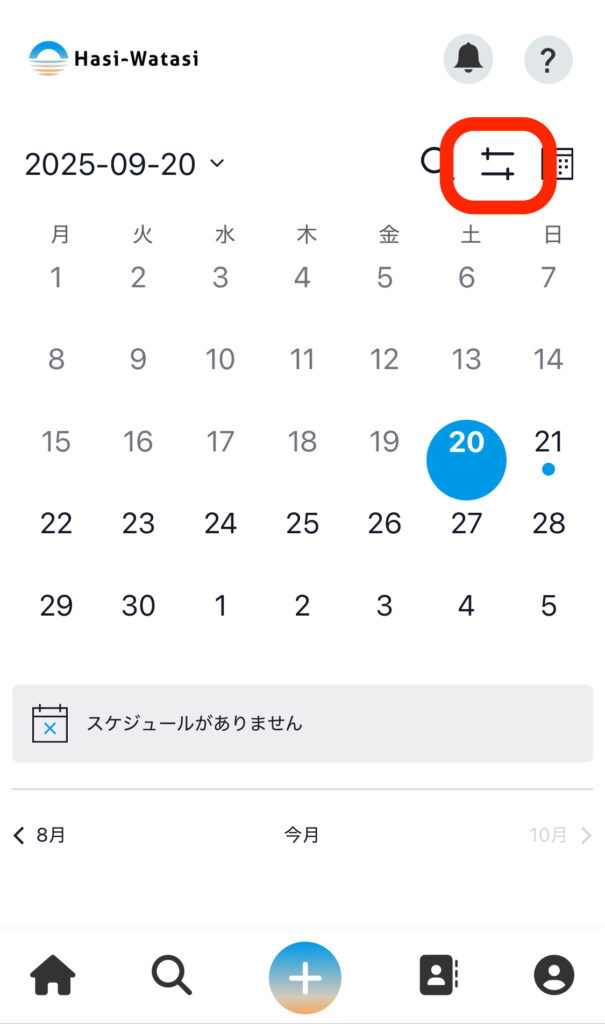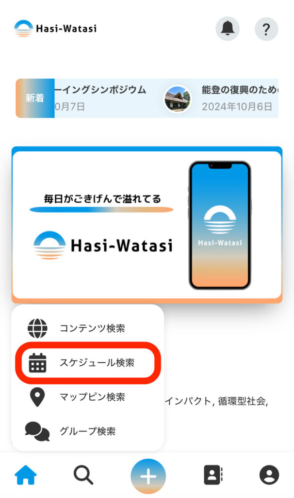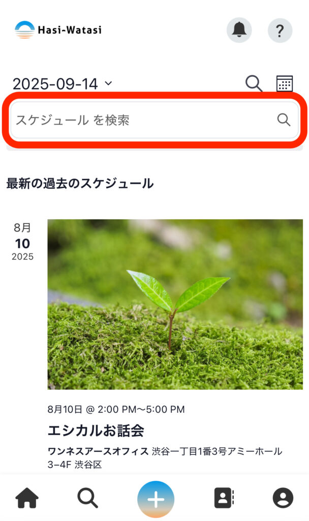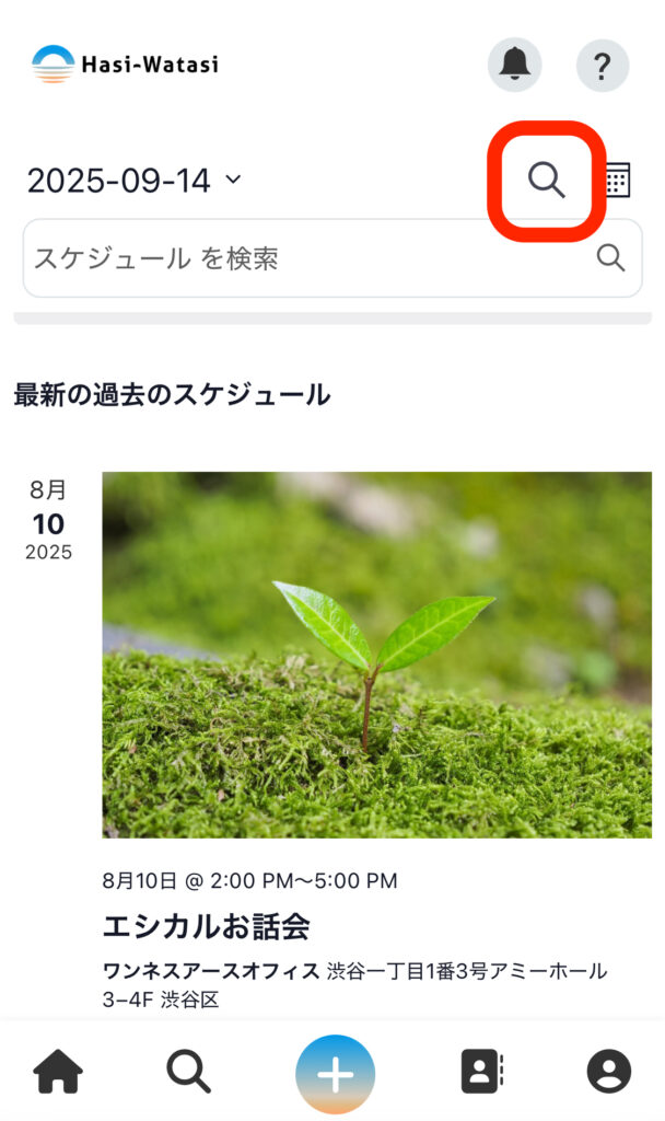 ①「虫眼鏡」アイコンにカーソルを合わせ(スマホの場合は押し)、「スケジュール検索」を押します。