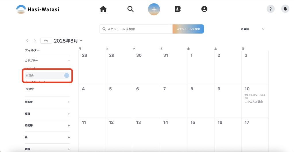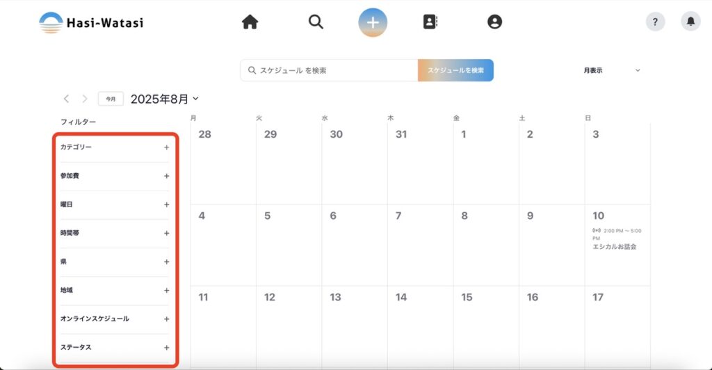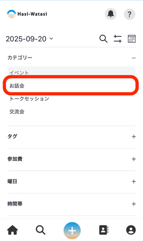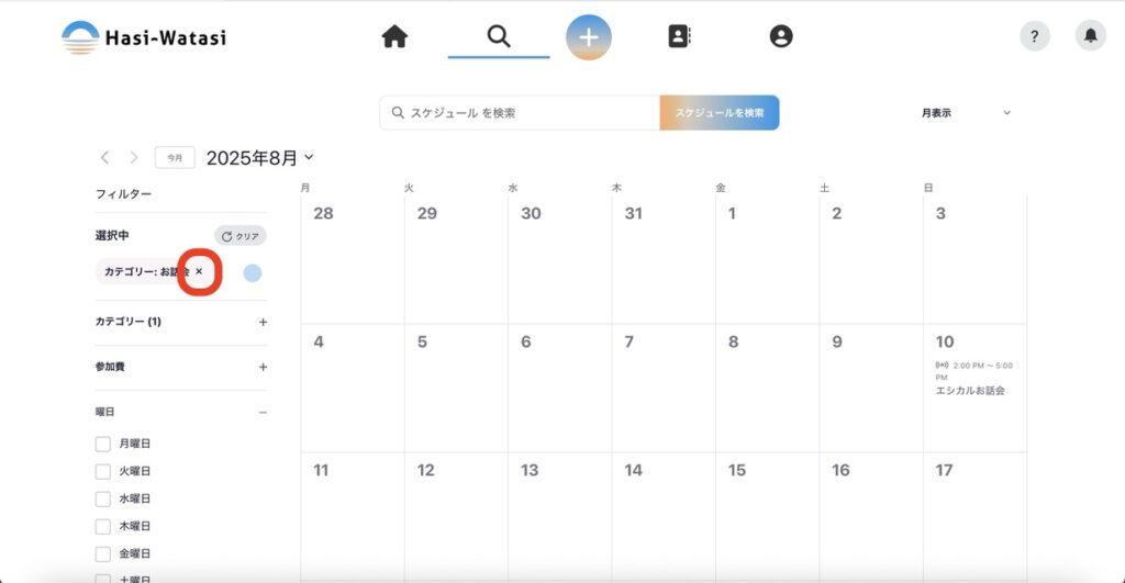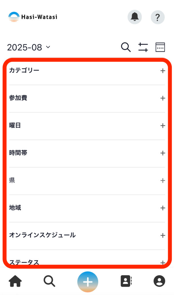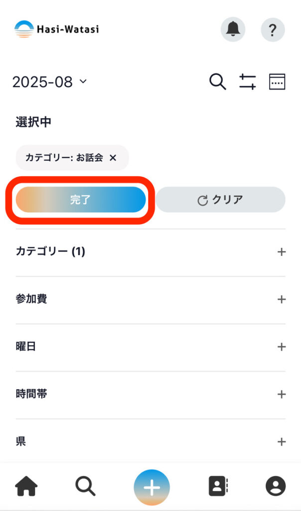 ⑤フィルターを使ってスケジュールを絞り込むこともできます。それぞれのフィルターを押すと選択肢が出てくるので、好きな選択肢を選択します。スマホの場合は、選択肢をすべて選べたら「完了」ボタンを押します。