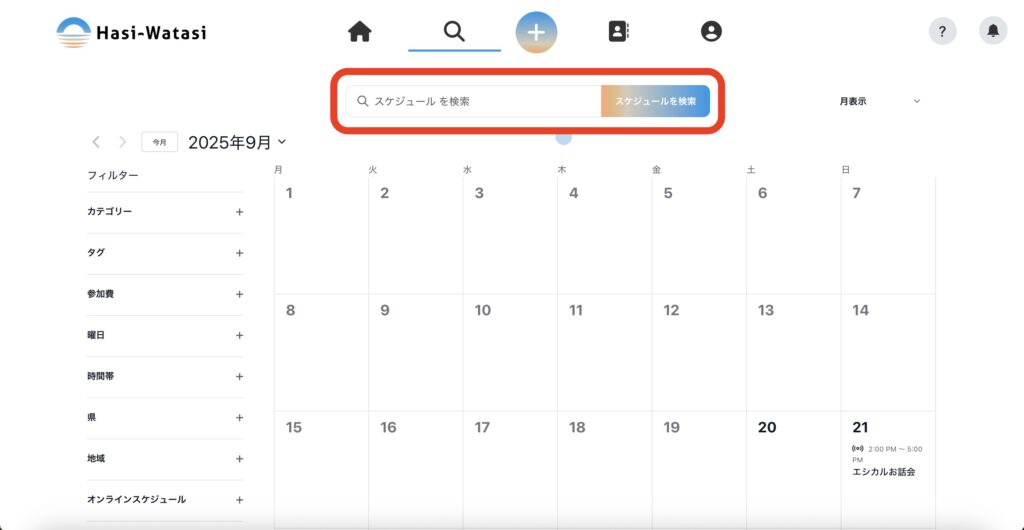 ④キーワードでスケジュールを検索したいときは、一番上の検索ボックスにキーワードを入力し、「スケジュールを検索」ボタンを押します。
