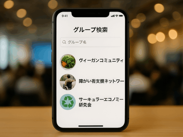 作成されたグループをキーワードやカテゴリー、タグで検索することができます。 手順 ①「虫眼鏡」アイコ …